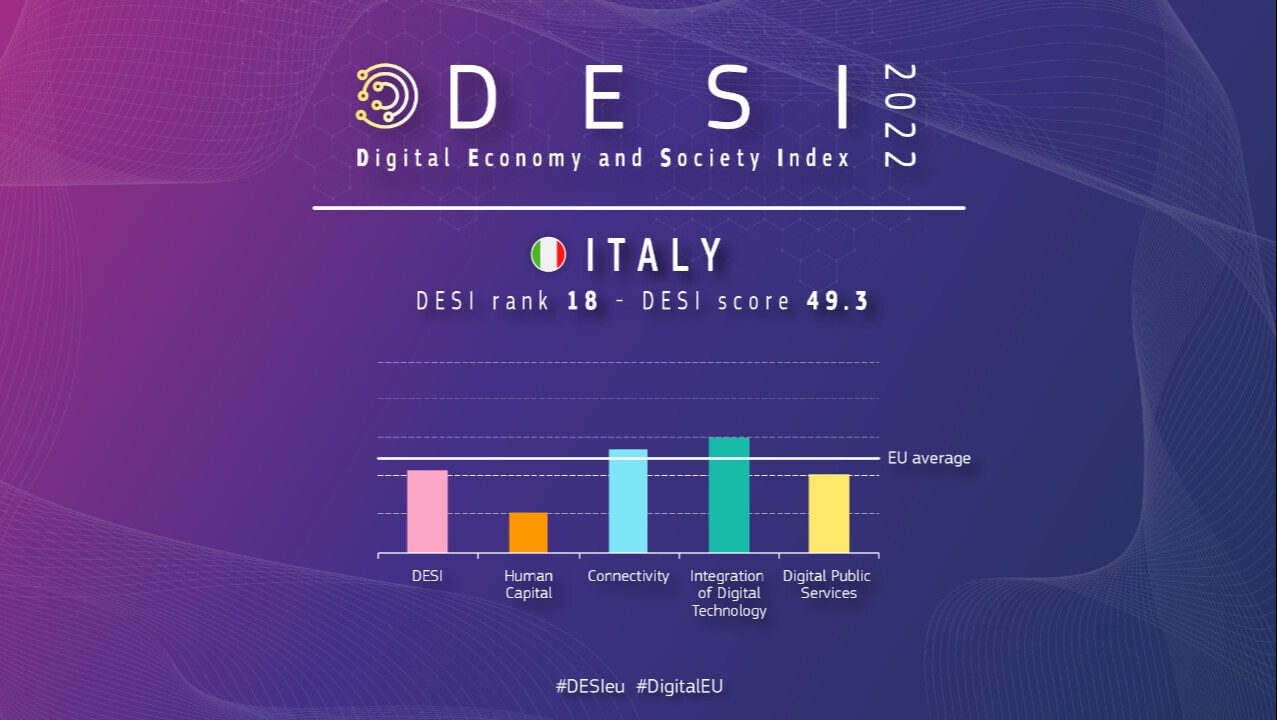 Per l'edizione 2022 dell'indice di digitalizzazione dell'economia e della società (DESI) l'Italia si colloca al 18° posto fra i 27 Stati membri dell'UE. Poiché l'Italia è la terza economia dell'UE per dimensioni, i progressi che essa compirà nei prossimi anni nella trasformazione digitale saranno cruciali per consentire all'intera UE di conseguire gli obiettivi del decennio digitale per il 2030. L'Italia sta guadagnando terreno e, se si considerano i progressi del suo punteggio DESI negli ultimi cinque anni, sta avanzando a ritmi molto sostenuti.